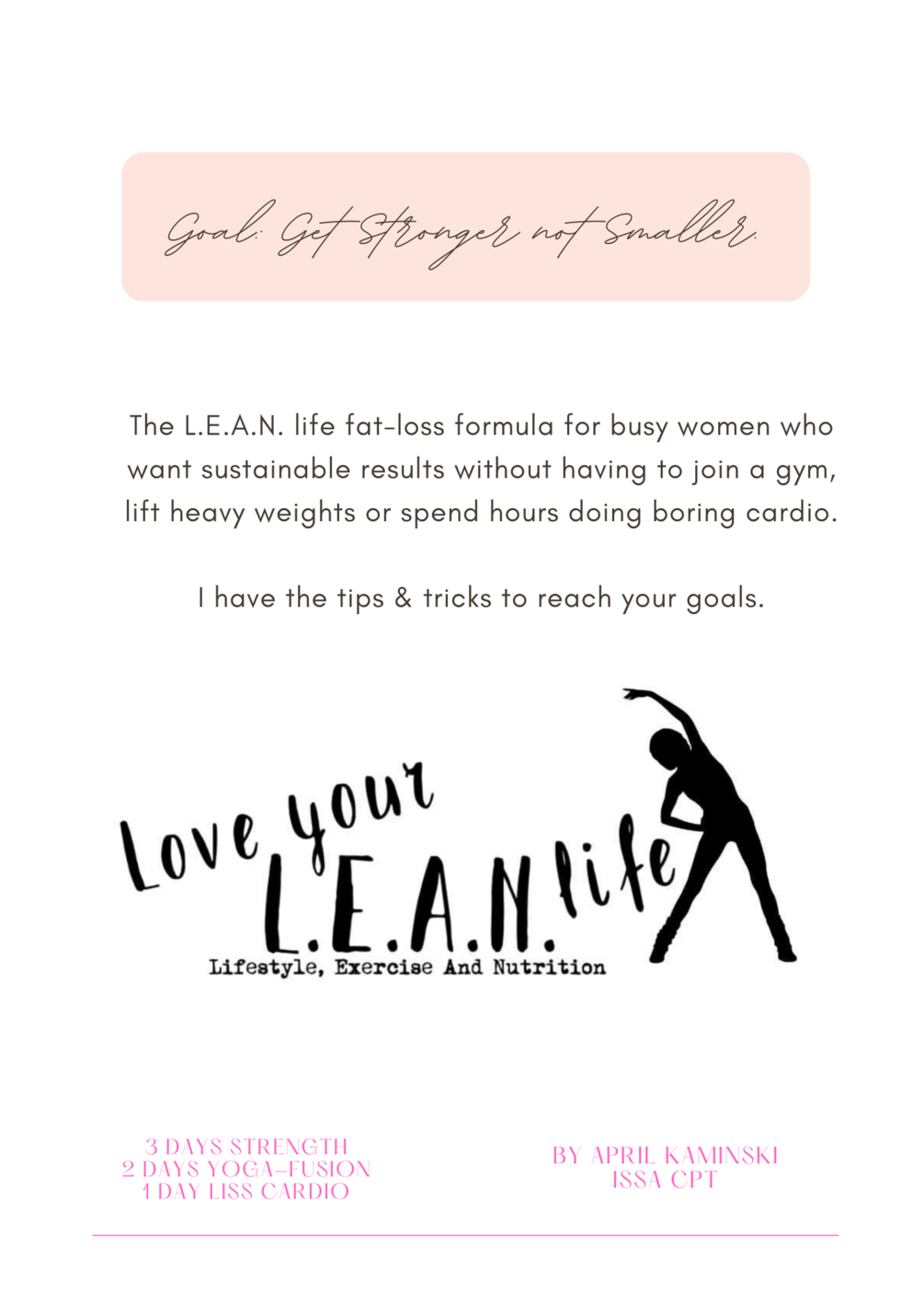 The L.E.A.N. life fat-loss formula for busy women who want sustainable results without having to join a gym, lift heavy, or spend hours doing boring cardio. I have the tips & tricks to have you reach your goals.